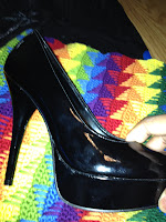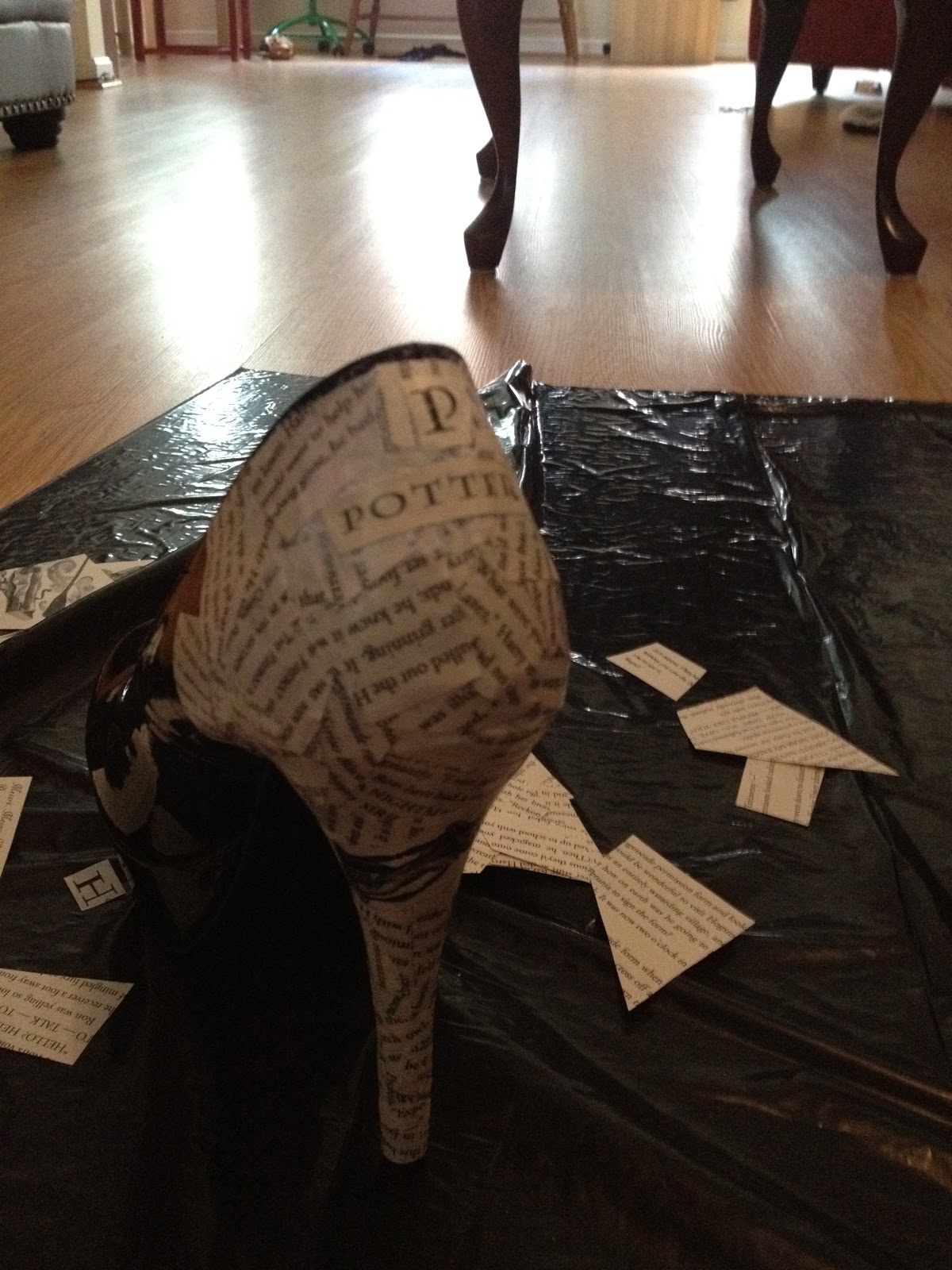 I just went out and bought very basic heels [I went with black patent heels that had a bit of a platform to them, which was a total personal preference]. Then spent a couple of hours cutting up the pages of a Harry Potter book. I choose book 2 merely because I loved the quotes scattered throughout its pages and it was the only HP book that I had a copy of and was falling apart. I'm not going to list every step I took, that's why the link is posted if you so wish to make your own-although I must warn you... it is a very very long and tedious process... expect to spend the afternoon working on this.